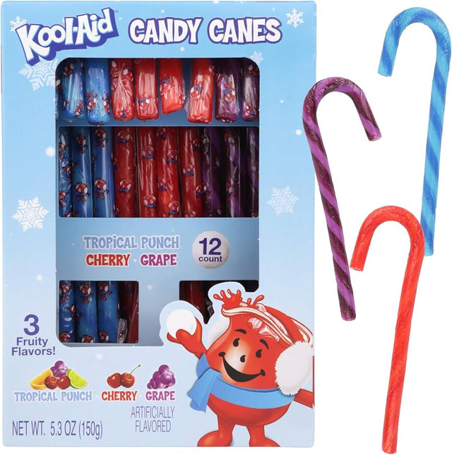 Add a burst of fruity fun to your holiday celebrations with Kool-Aid Candy Cradle Canes! Each 5.3oz package contains 12 candy canes infused with the classic, tangy flavors of Kool-Aid, offering a sweet and nostalgic treat for kids and adults alike.