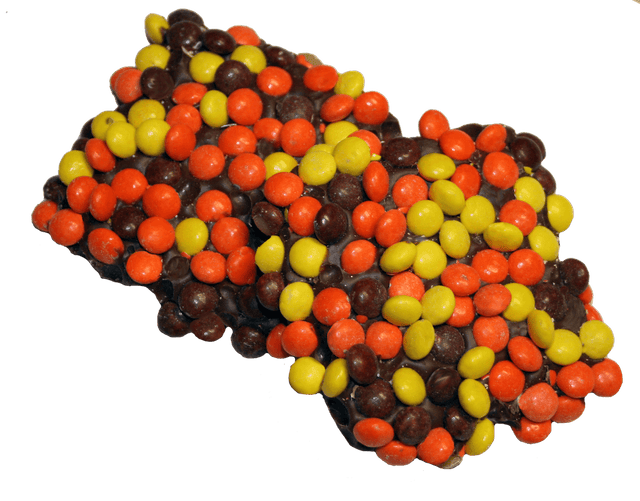 Crisp Graham Crackers Covered In Milk Chocolate covered in Reese Pieces.