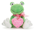 Green frog plush with large eyes on the top of its head and a large smile. Has a sheer pink ribbon around its neck and is holding a heart shaped pillow with the message "you make my heart leap".