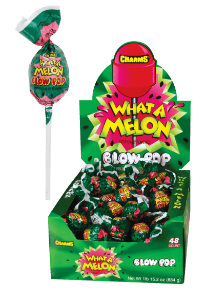 Display box contains 48 Charms What A Melon Blow Pops. Made in the USA.