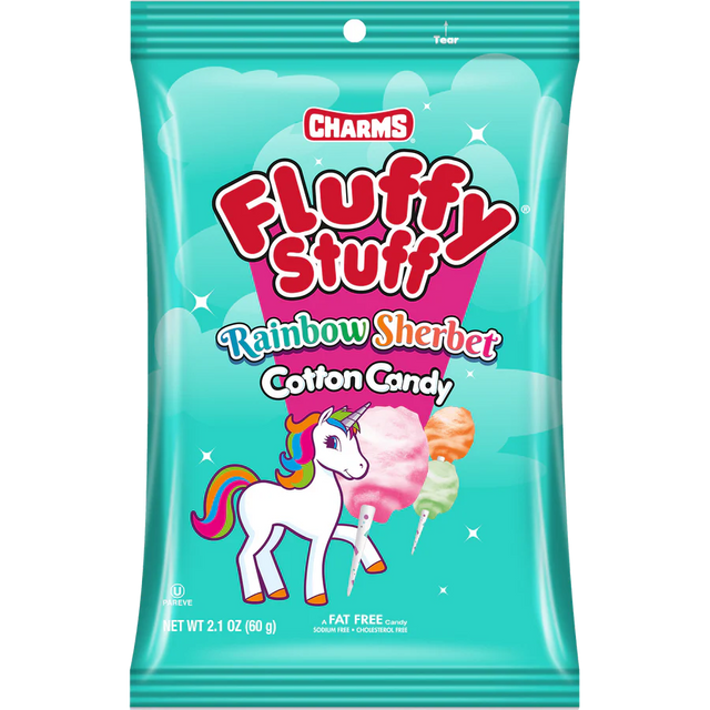 Fluffy Stuff Cotton Candy is classic carnival type delicious cotton candy. This exquisite "fluffy stuff" simply melts in the mouth. A box of Charms Fluffy Stuff Cotton Candy contains 24 bags of cotton candy. 3.5 ounce per bag.